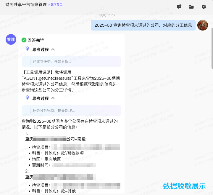 跨系统无缝问询跨:系统问询被收敛到一个入口,员工可以通过过自然语言实时查询流水状态、付款进度、结账检查结果等多维度信息;查询与核对由 Agent 在后台完成,再把结构化结果回给提问者,进一步提升财务共享服务沟通效率、反馈及时性及用户满意度;