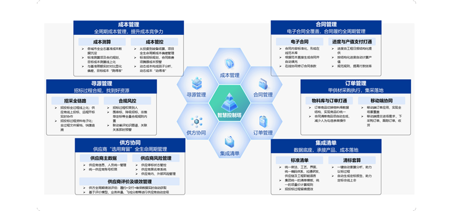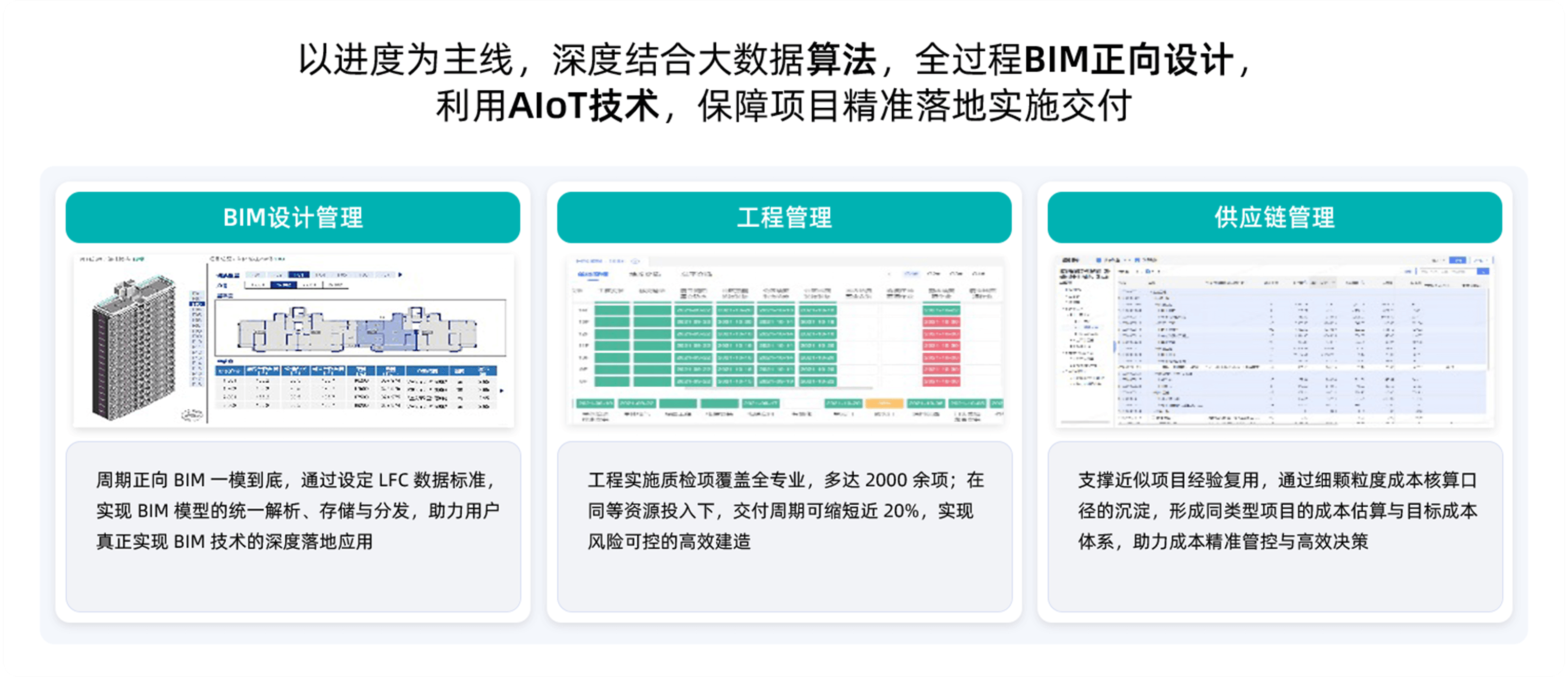以建设方全局管控为核心,深度融合 BIM 设计协同、工程全流程管控与供应链智能协同,