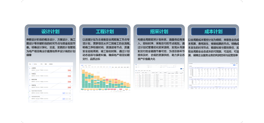 以全周期进度计划为主线,整合设计、工程、招采、成本专项计划,实现计划动态穿透与各参与方协同。通过关键节点精准管控与进度偏差预警,串联 “策划 - 实施 - 验收” 全流程,为项目高效推进提供清晰节奏与执行依据。