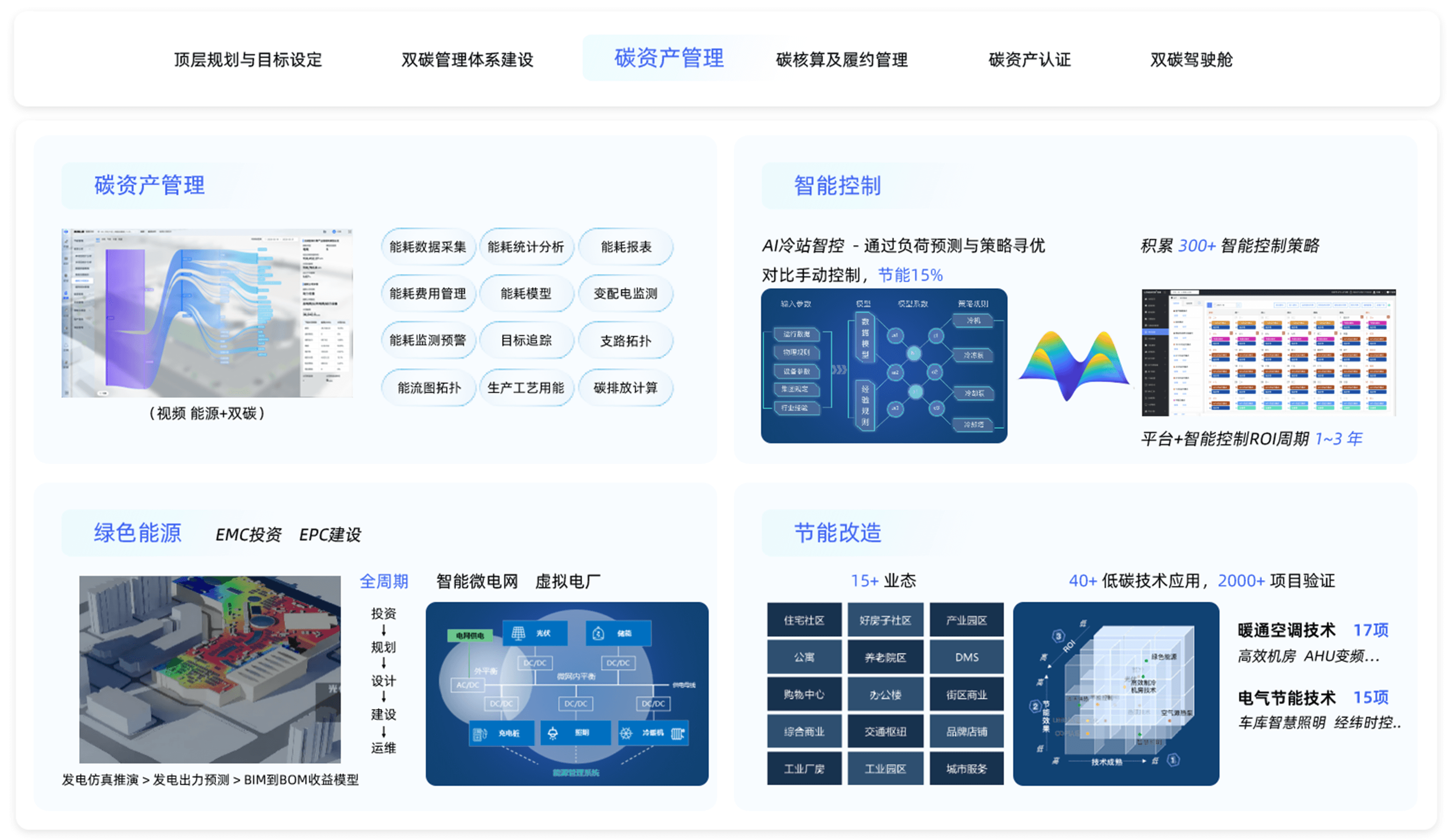 针对 15+ 业态,经 2000+ 项目验证,涵盖暖通空调、电气节能、智慧照明等领域技术,提供节能改造全过程咨询服务。